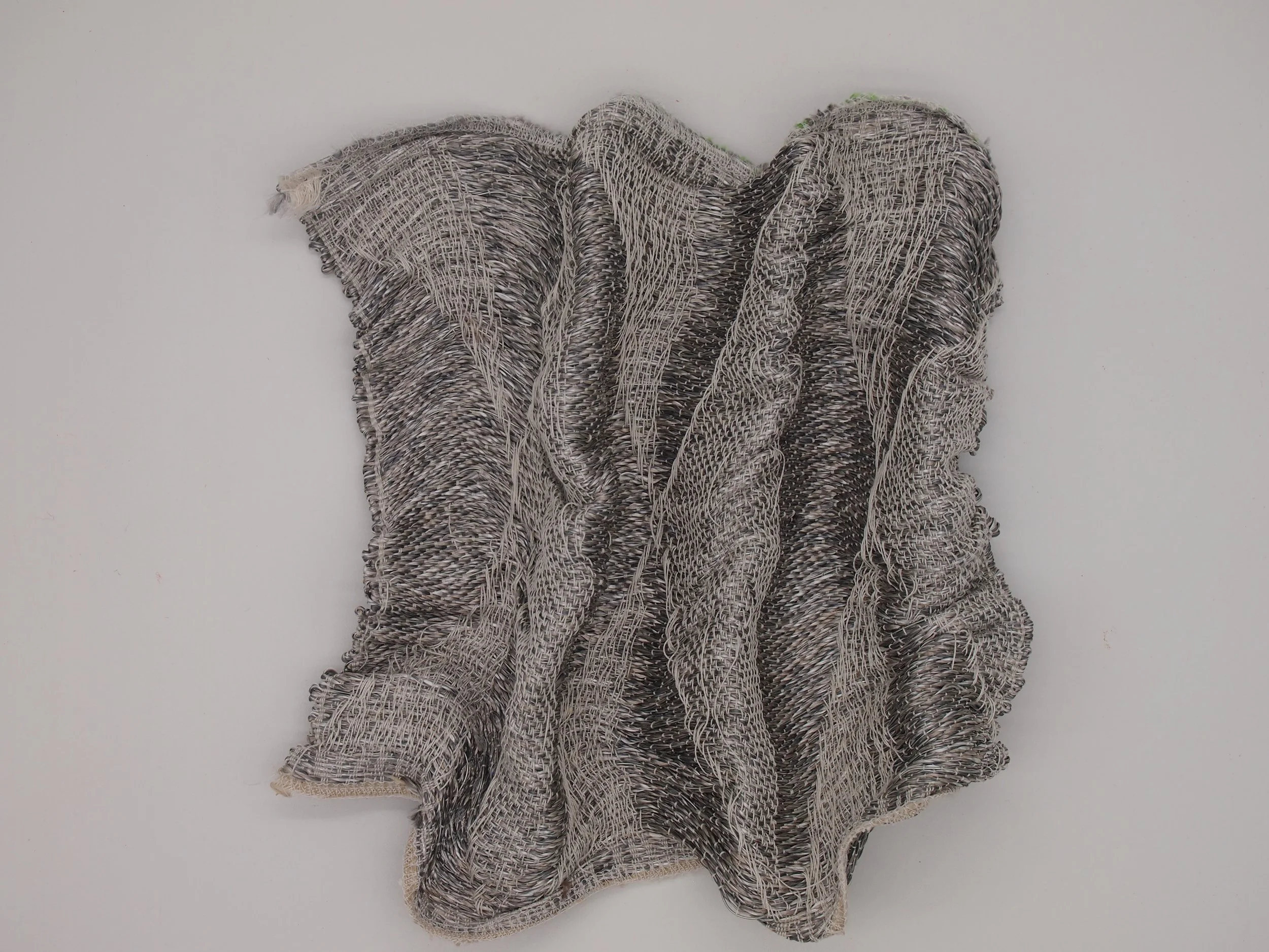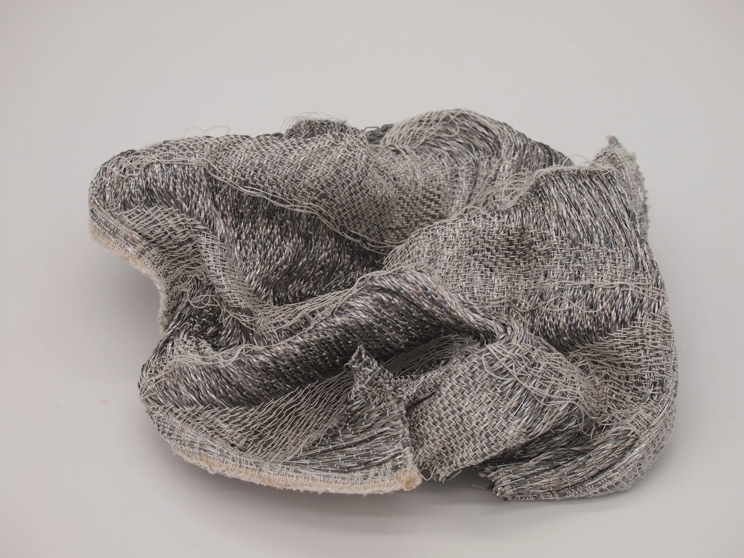 Experimental “memory weaving” was crafted by weaving wire and acrylic weft with cotton warp. The material can offer endless possibilities for manipulated forms and hold shape (memory). Woven on a TC2 loom.