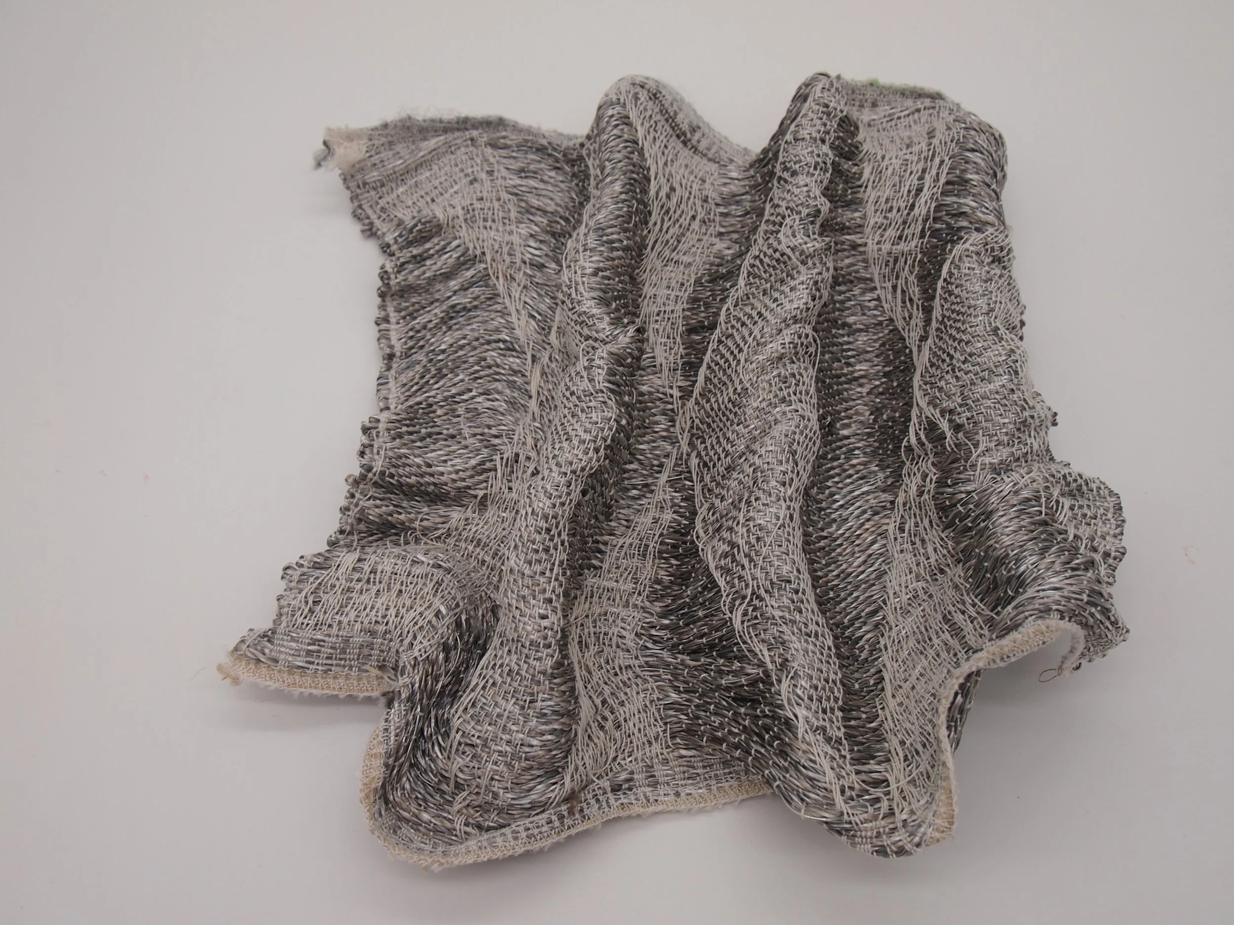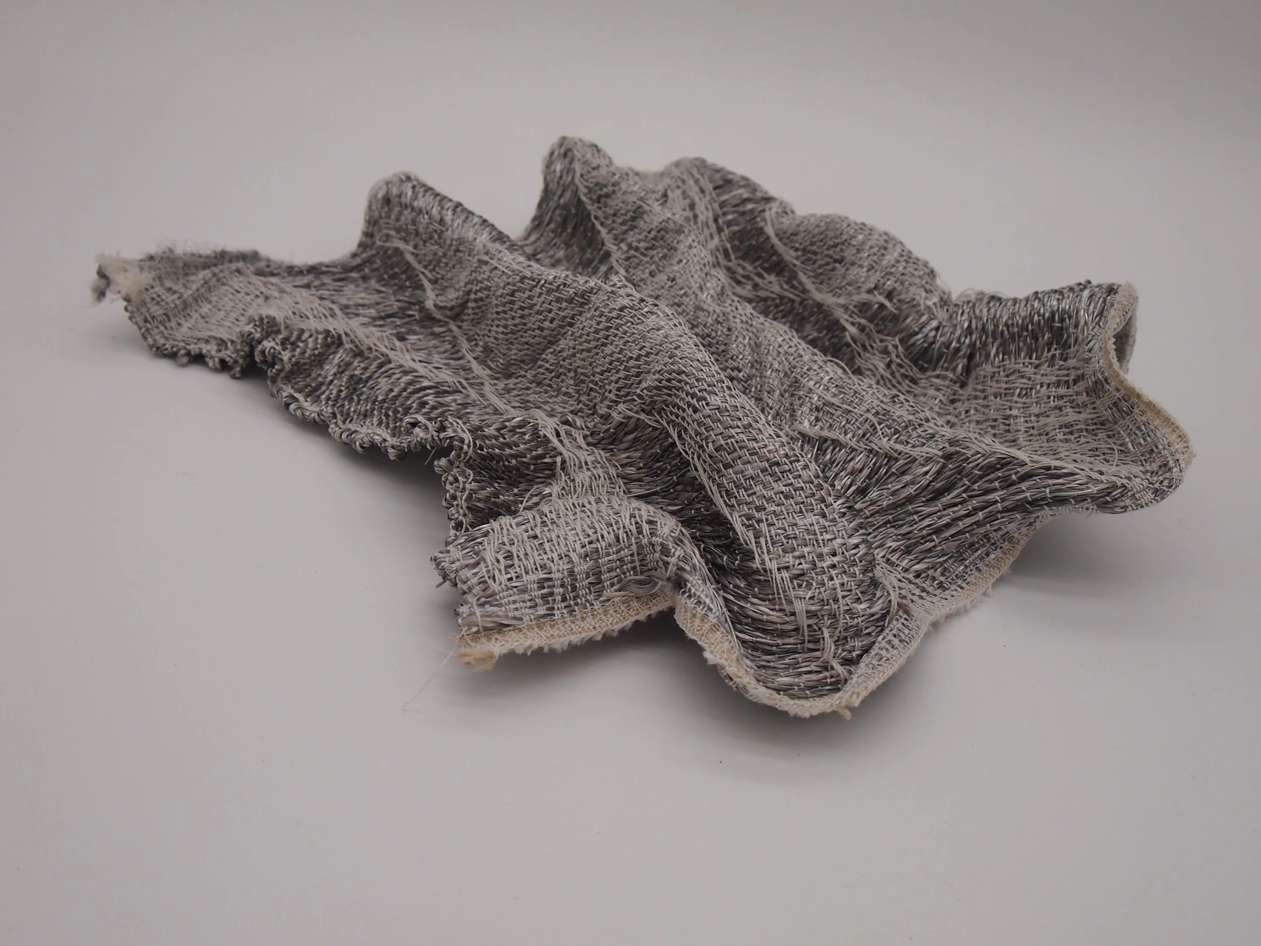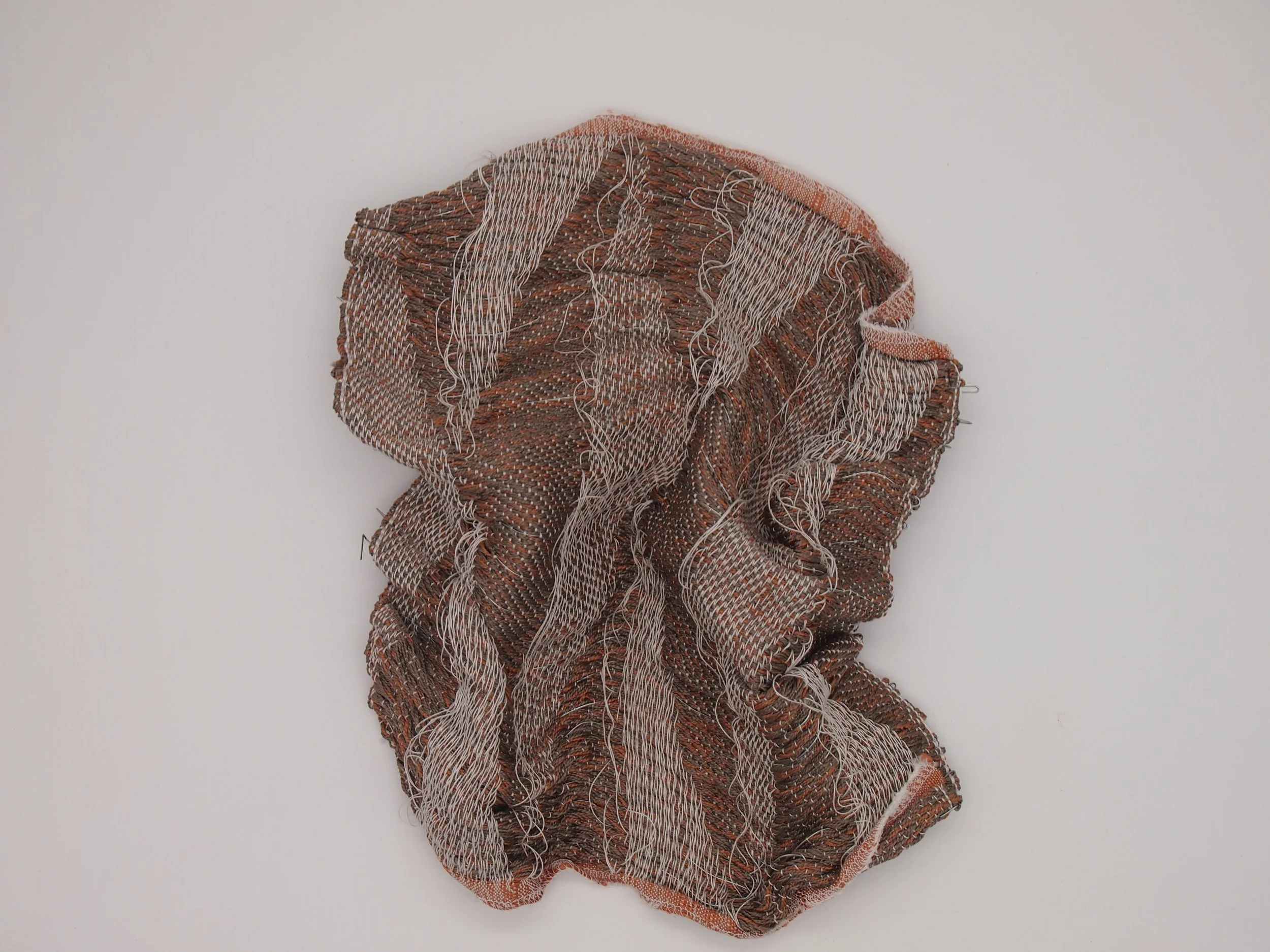 Experimental “memory weaving” was crafted by weaving wire and acrylic weft with cotton warp. The material can be formed and hold shape (memory). Woven on a TC2 loom: